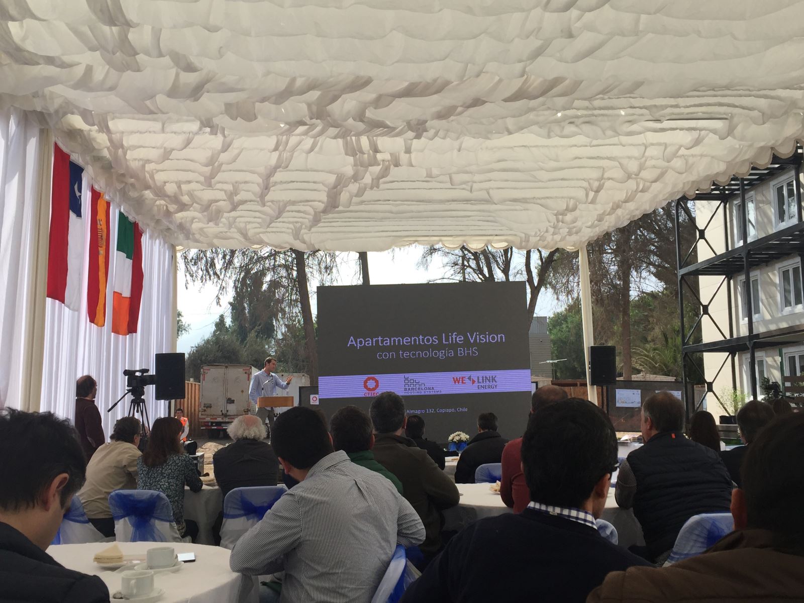 来自智利军方、智利住建部、欧洲桑坦德银行、智利银行以及智利、厄瓜多尔、哥伦比亚、阿根廷及乌拉圭的主要地产开发商及建筑公司代表共计50余人参加了庆典活动。仪式上,参会人员认真听取了项目的整体施工情况及主要设计思路,他们对“新房屋+新能源”的模式显示出极大兴趣,对51吃瓜 工程国际化的经营理念和管理模式给予高度赞许。CNN CHILE 等主流新闻媒体均派记者报道了本次庆典活动。