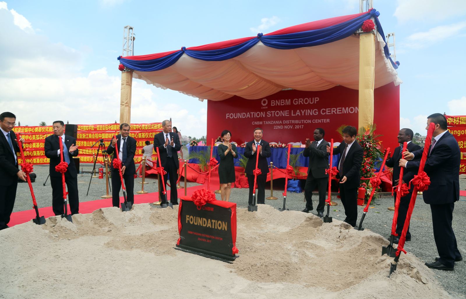 在考察北新集团坦桑尼亚公司时,宋志平出席了坦桑公司分拨中心奠基仪式,并与中国驻坦桑尼亚大使王克,坦桑尼亚工业、贸易&投资部长姆维贾盖,Dangote集团CEO赖塔塔共同为分拨中心奠基。今年是北新集团坦桑公司进入坦桑十周年,十年间公司发展成为以钢材、水泥、陶瓷为三大主营产品、在坦桑当地极具规模效应和影响力的建材产品供应商。分拨中心的奠基仪式开启了集团在坦桑发展的新平台,为集团在坦桑尼亚深入发展奠定了更加夯实的基础。