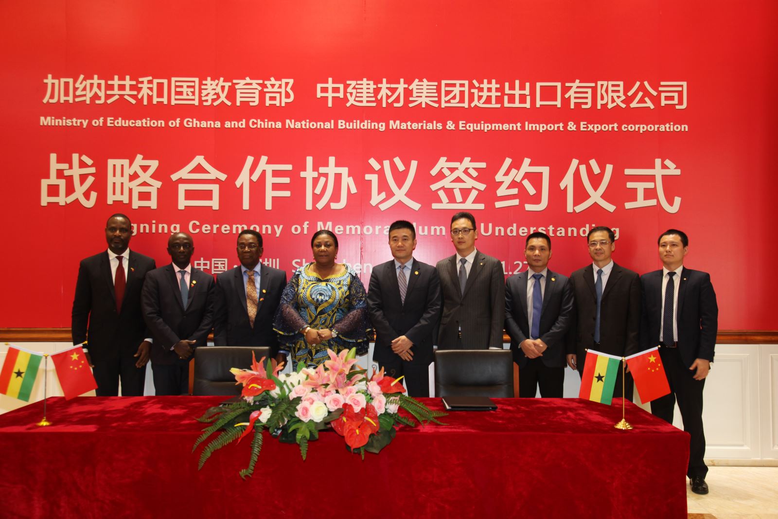 加纳国家教育部部长Prof. Kwesi Yankah、加纳驻中国大使Mr. Edward Boateng、中建材进出口海外拓展事业部、中建材陆海投资、中建材通用机械有关负责人参加会议及签约仪式。