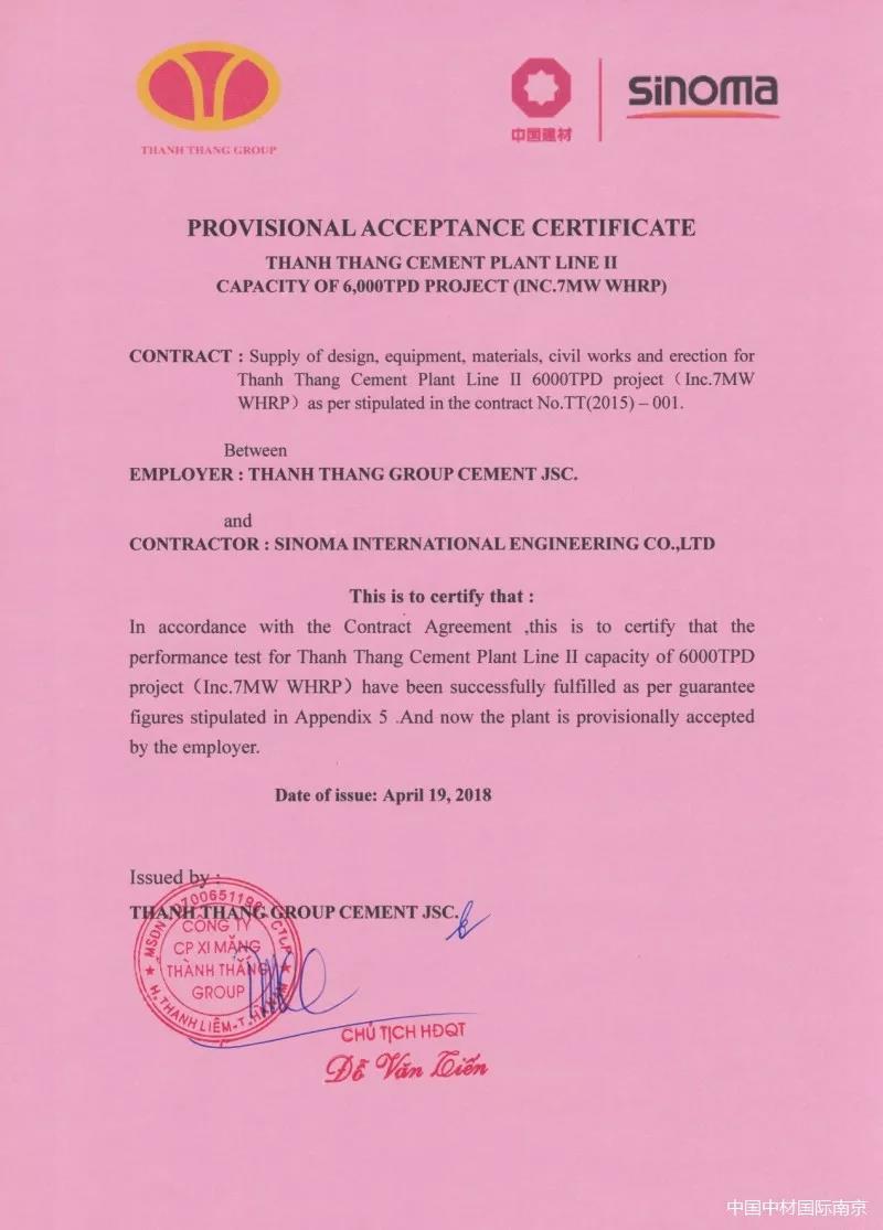 中材国际(南京)总承包的越南成胜水泥项目获得PAC证书