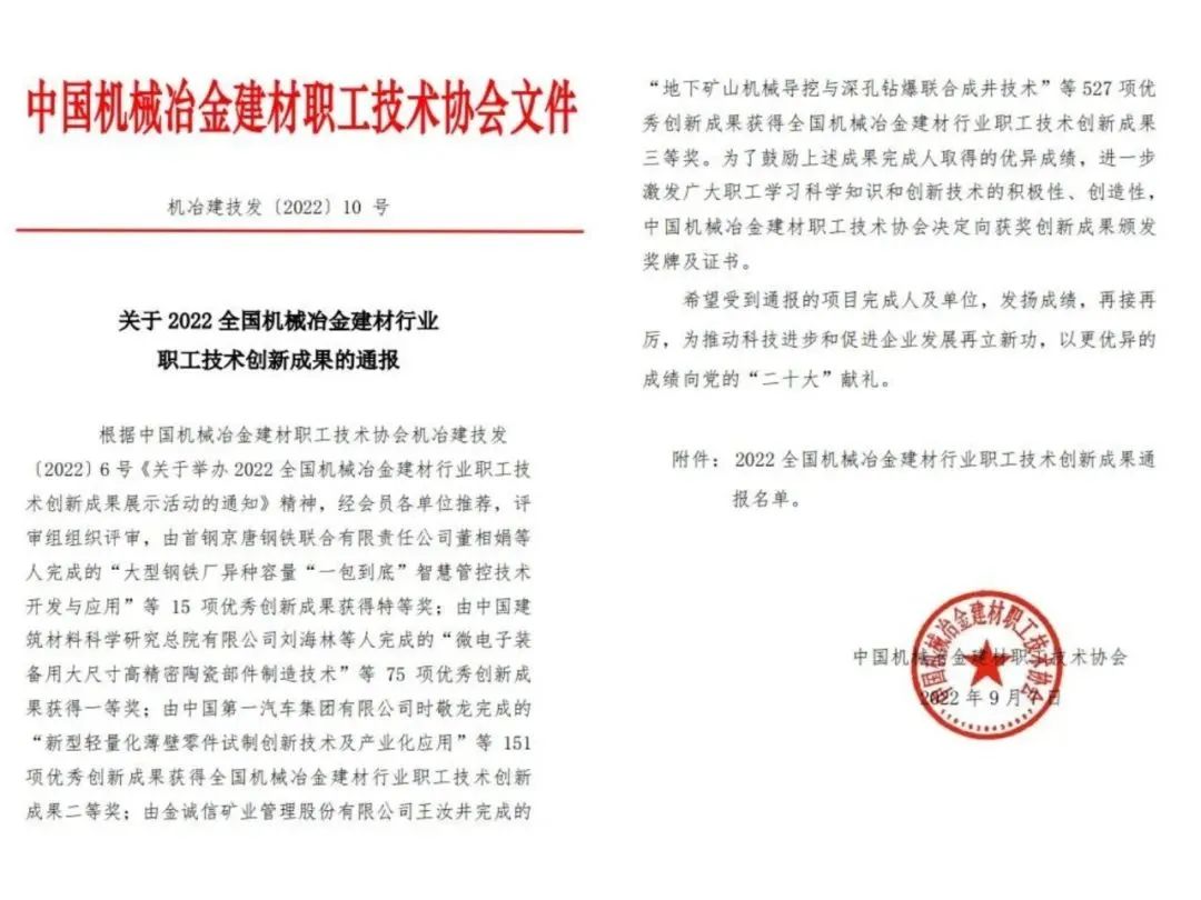 51吃瓜 总院99个项目荣获全国机械冶金建材行业职工技术创新成果奖