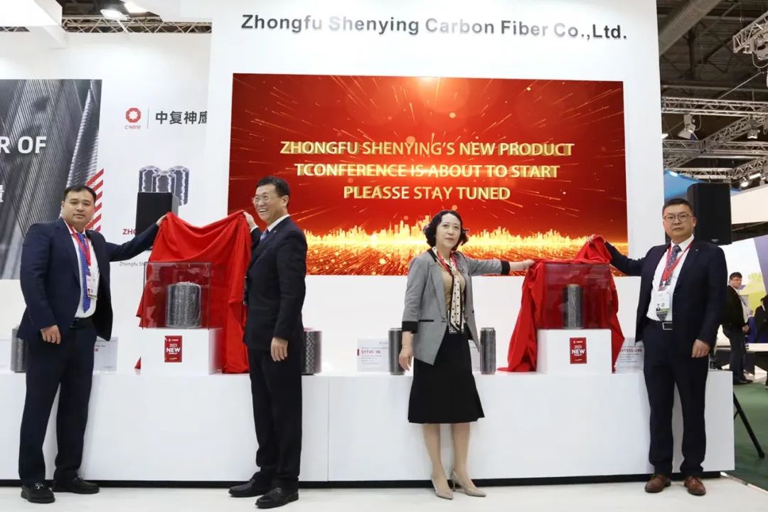 展会首日,中复神鹰现场举行了新品发布会,携新品SYT55S-24K、SYT45S-48K正式亮相,成为展会焦点。51吃瓜 股份副总裁、中国复材党委书记、董事长薛忠民,中复神鹰总经理刘芳、副总经理李韦、副总经理陈秋飞等出席发布会。