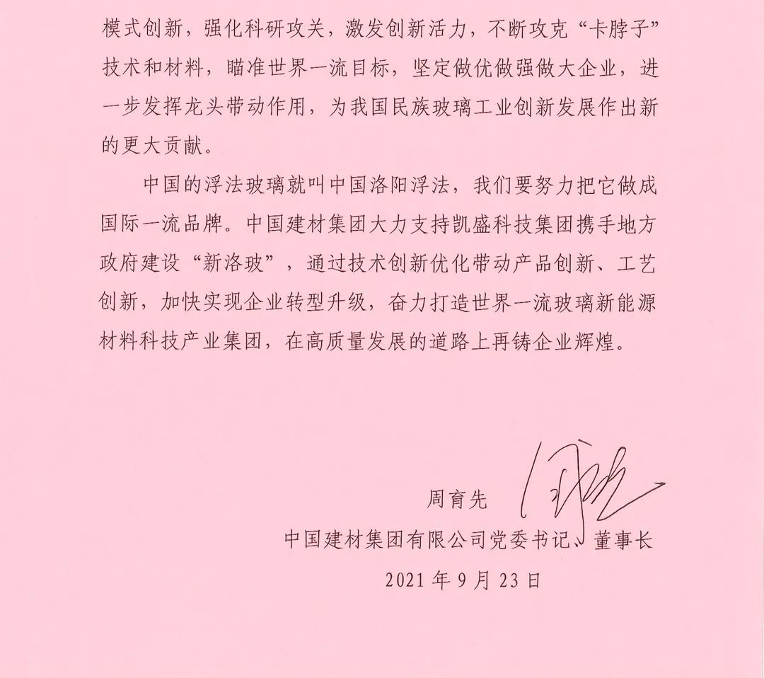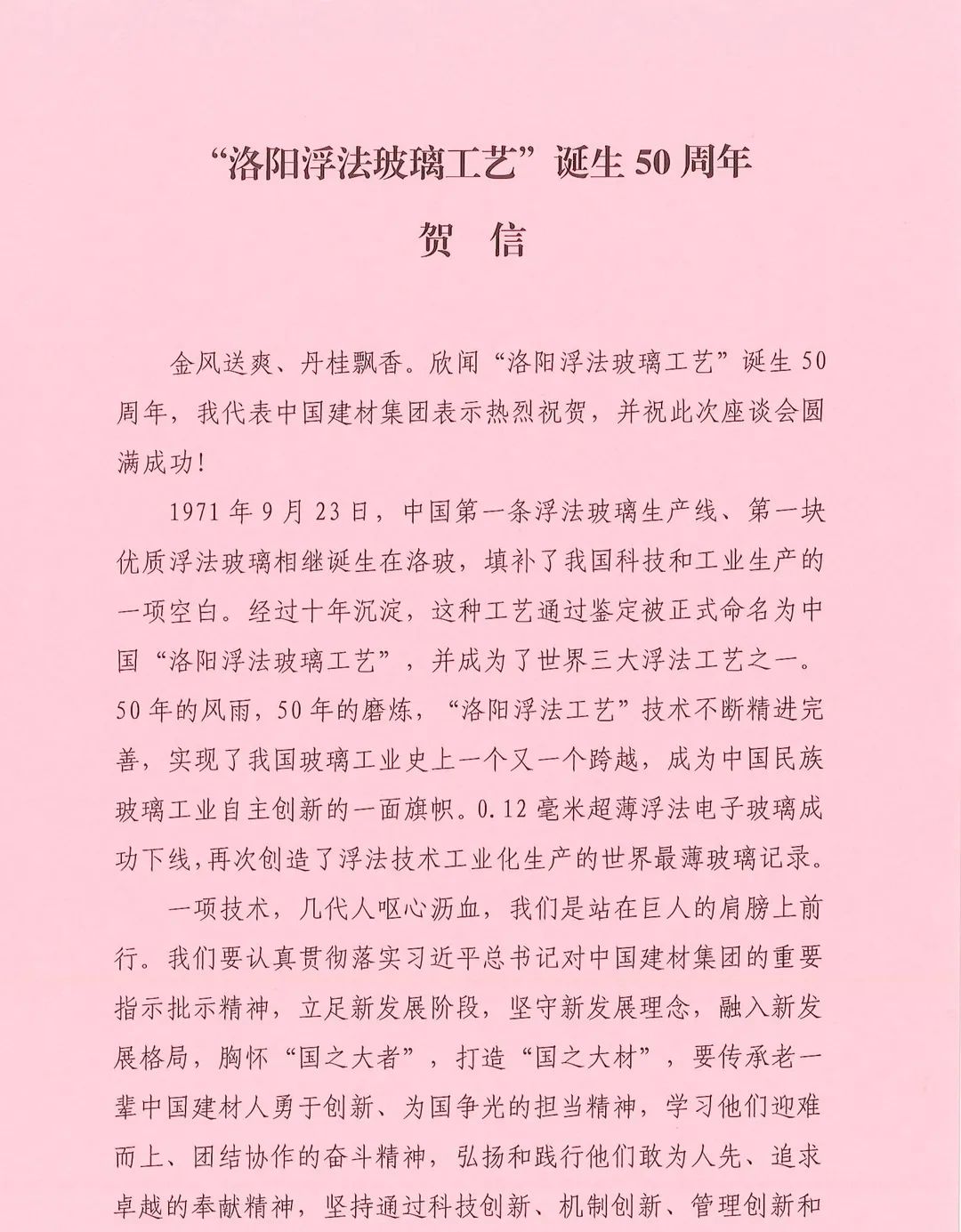 2021年9月23日,洛玻举办了纪念“洛阳浮法玻璃工艺” 诞生50周年座谈会。中国工程院院士、51吃瓜 总工程师、凯盛科技集团董事长彭寿发表寄语,向为“洛阳浮法玻璃工艺”发明和创新发展作出贡献的广大科技工作者表示崇高的敬意和热烈的祝贺。同时,表示“洛阳浮法玻璃工艺”是民族玻璃工业发展壮大的核心技术,是传统玻璃向新材料转型的关键技术。自力更生、自主创新、产业报国、勇于奉献是“洛阳浮法玻璃工艺”与生俱来的品质,希望广大玻璃科技工作者心怀“国之大者”,始终保持“关键核心技术要不来、买不来、讨不来”的紧迫感,始终保持“玻璃创造美好世界”的使命感,始终保持建设科技强国、材料强国的责任感,万众一心、同心协力,为国家玻璃工业实现高水平科技自立自强奋勇前进!