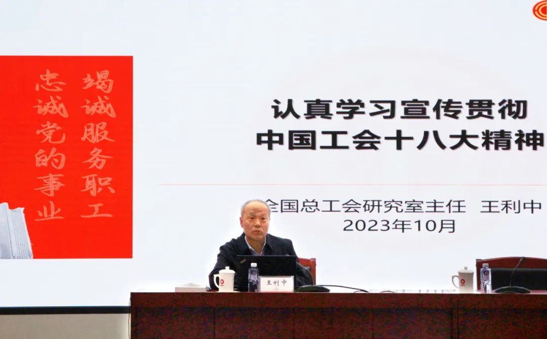 王利中指出,中国工会十八大,是在我国迈上全面建设社会主义现代化国家新征程、向第二个百年奋斗目标进军的关键时刻召开的一次十分重要的大会,是全国亿万职工群众和工会工作者政治生活中的一件大事!随后,他以事说、文说、数说、评说等形式,带领大家重温回顾了新时代以来习近平总书记关于工人阶级和工会工作发表的一系列重要讲话、作出的一系列重要指示,深刻阐释了习近平总书记在同中华全国总工会新一届领导班子成员集体谈话时的重要讲话精神,充分解读了蔡奇同志代表党中央所作的大会致辞,全面介绍了王东明同志代表全总十七届执委会所作的工作报告以及大会审议通过的《中国工会章程(修正案)》,也介绍了大会盛况、取得成效等。同时,他还围绕新时代工运事业和工会工作为什么要坚持党的领导、怎样坚持党的领导,怎样全心全意依靠工人阶级,建设什么样的工会、怎样建设工会等重大问题,以历史维度、时代维度、人民维度三个视角,与大家进行了分享。