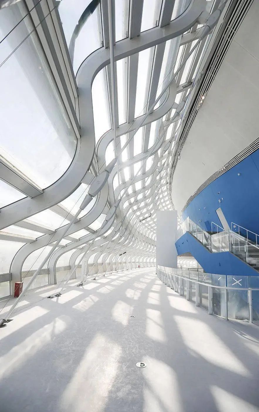 北京冬奥会国家速滑馆又称“冰丝带”,因其复杂曲面幕墙外的银白色弯弧中空玻璃和夹层玻璃灯带结合起来宛如一圈圈“冰丝带”,夜景照明系统开启后色彩纷呈,轻盈跃动,如丝带曼舞而得名。