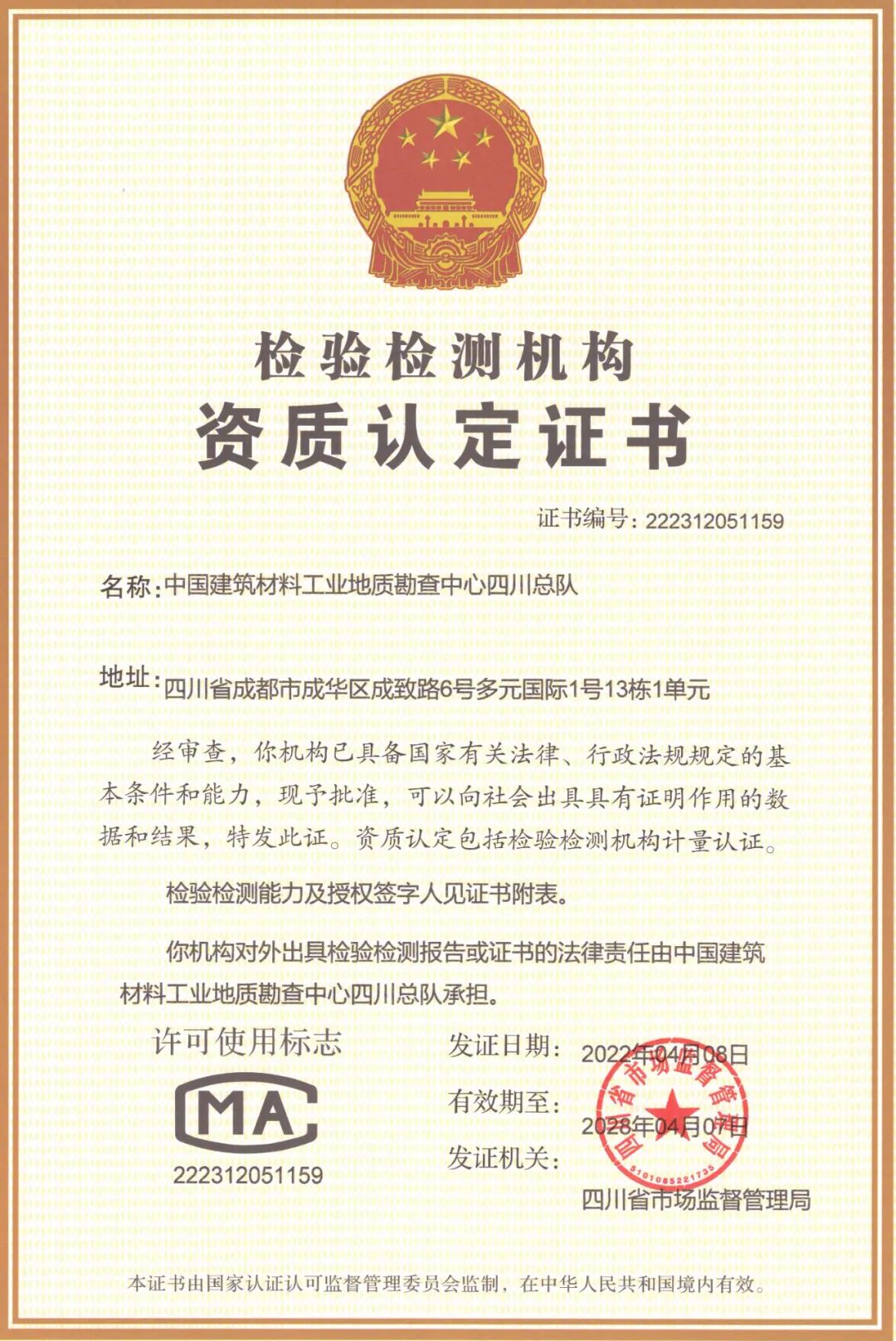 四川总队检验检测机构资质认定证书
