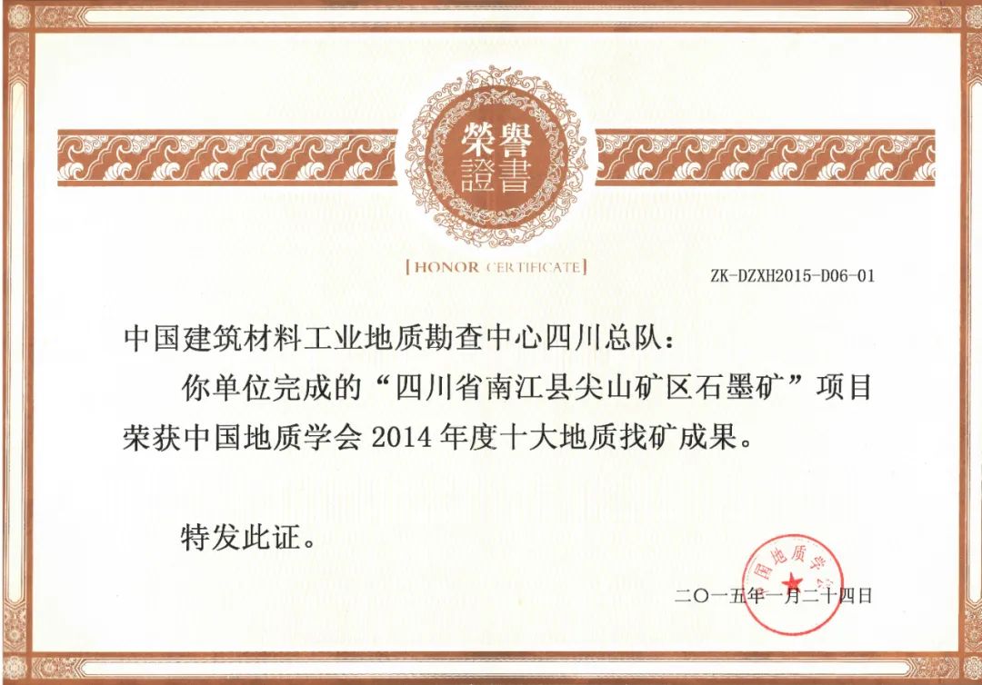 四川总队荣获中国地质学会2014年度十大地质找矿成果