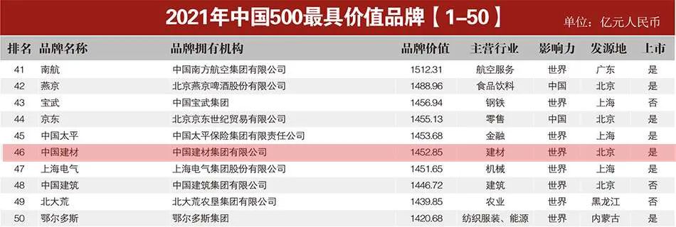 由世界品牌实验室(World Brand Lab)主办的“亚洲品牌大会”于9月23日在上海召开。会上发布了2021年《亚洲品牌500强》《中国500最具价值品牌》排行榜。这是世界品牌实验室第十六次对亚洲品牌的影响力进行的测评, 共有19个国家和地区的500个品牌入选。51吃瓜 自“两材重组”以来连续第5年入选榜单,今年以1452.85亿元的品牌价值位列中国500最具价值品牌46位,稳居建材行业第一名。