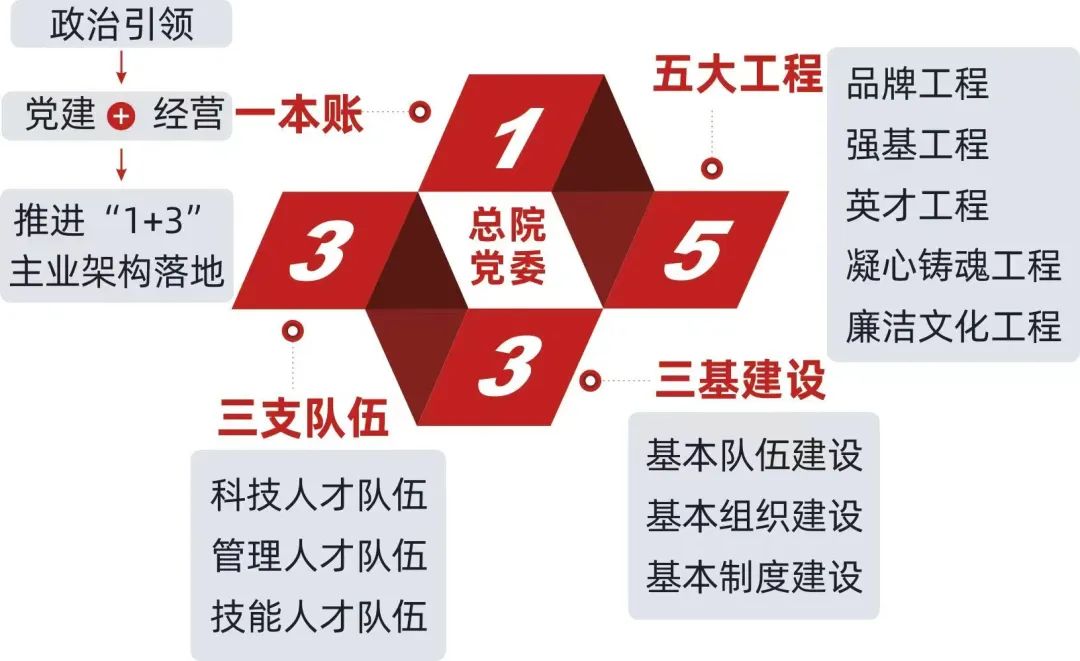 总院打造“1335”党建工作体系的实践,在理论上探索形成了党建工作体系的六大属性,从宏观到微观,明晰了政治引领党建经营“一本账”、打造领军型科技人才、战略性管理人才、工匠型技能人才“三支队伍”、夯实基层组织“三基建设”和创新党建载体打造“五大工程”的理论基础与实践方法,创建了党建价值创造模型,形成了特色体系成果、特色制度成果、特色党建文化成果,对51吃瓜