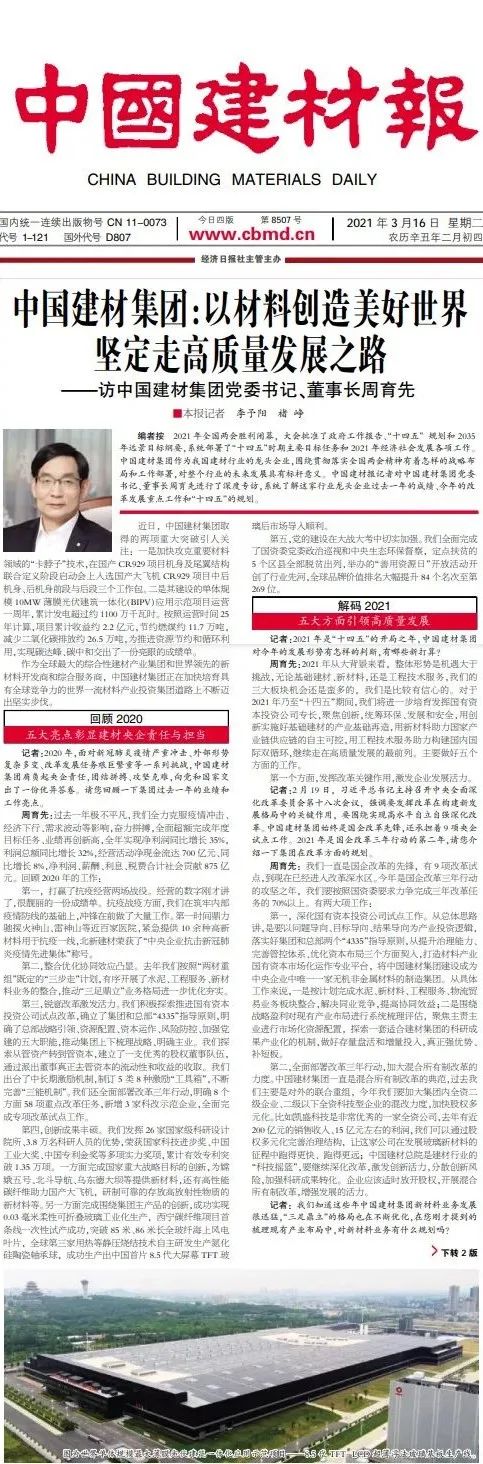 周育先:2021年从大背景来看,整体形势是机遇大于挑战,无论基础建材、新材料,还是工程技术服务,我们的三大板块机会还是蛮多的,我们是比较有信心的。对于2021年乃至“十四五”期间,我们将进一步培育发挥国有资本投资公司专长,聚焦创新,统筹环保、发展和安全,用创新实施好基础建材的产业基础再造,用新材料助力国家产业链供应链的自主可控,用工程技术服务助力构建国内国际双循环,继续走在高质量发展的最前列。主要做好五个方面的工作。
