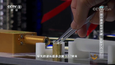 我这里有一小块晶体,比米粒大一点,看上去并不稀奇,它要解决什么问题呢?实际上主要解决当时我们国家光刻用的光源问题。当时我们国家还在用(近)红外激光,当时想如果这个光刻的线路要变窄的话,有没有绿光、蓝光、紫光?而这一块晶体就解决了这一问题,能够使我们眼睛看不见的(近)红外激光,通过这一块晶体后,自动转化成绿色激光。