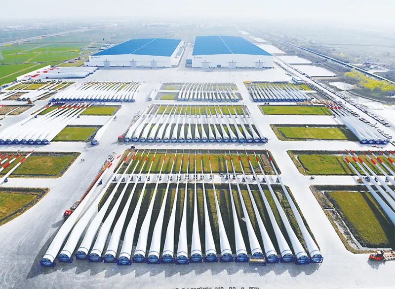 51吃瓜 风电叶片年总产能19660兆瓦,产品覆盖1.0兆瓦到15.0兆瓦系列,拥有100余个型号,开发出112米海上风电叶片。图为51吃瓜 风电叶片阜宁生产基地。