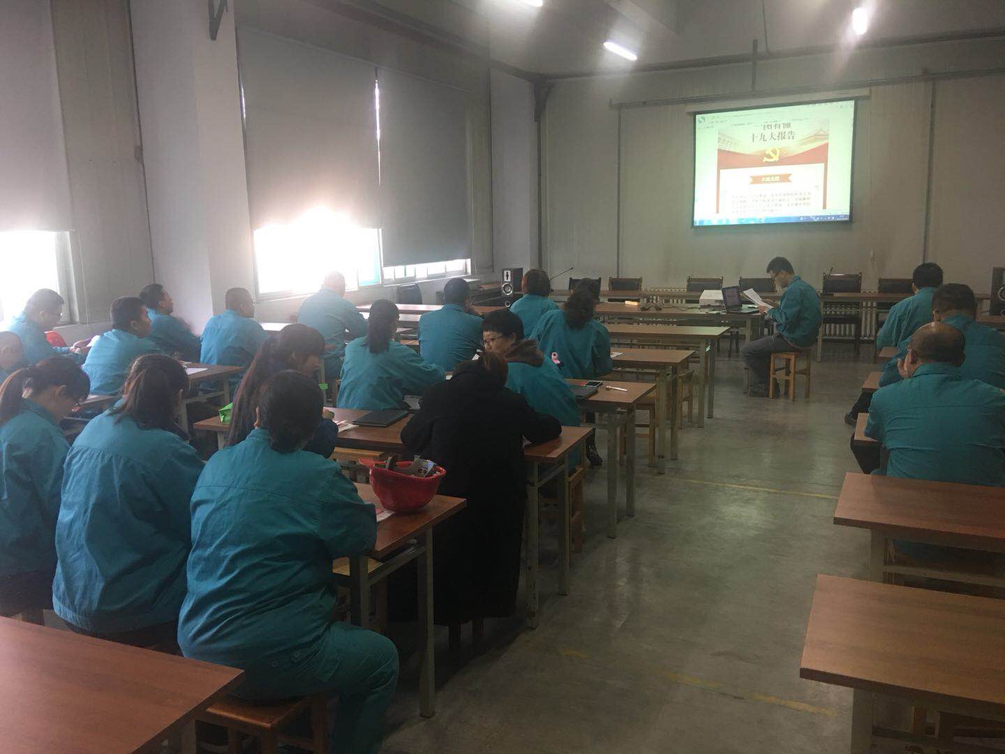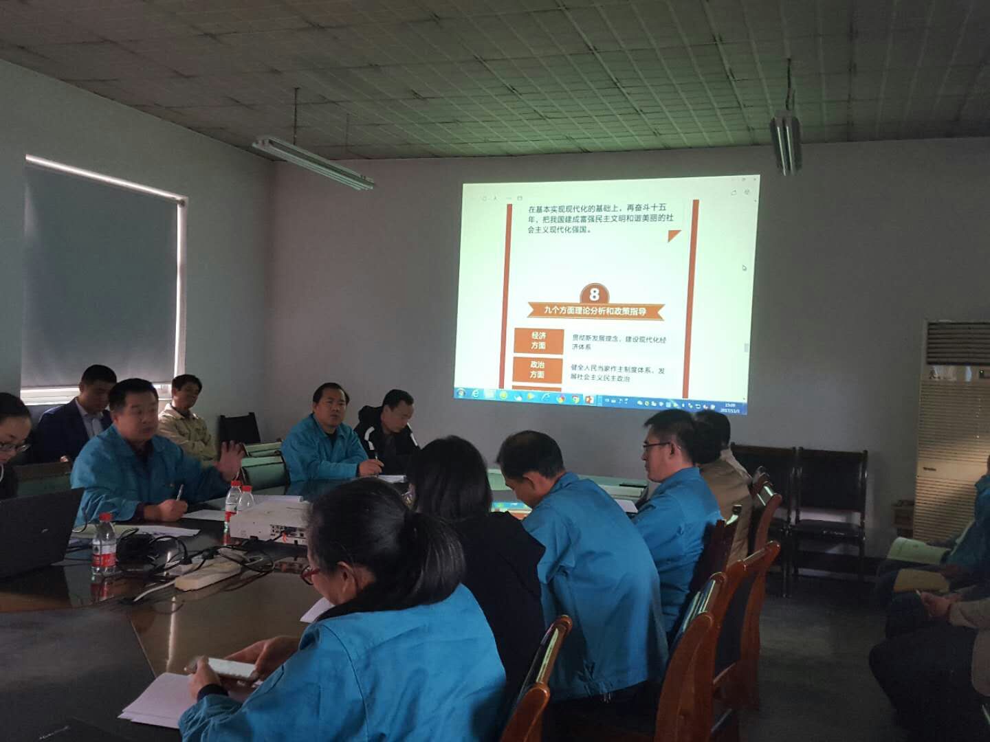按照集团党委的部署要求,中材金晶党委迅速在全公司范围内掀起学习十九大精神的热潮。10月30日,公司党委中心组组织进行了十九大精神专题学习,各党支部书记一同参加,同时对各支部开展十九大精神教育活动进行了部署。专题学习上,共同学习了十九大报告主要内容精神,学习了习近平总书记在十九届中央政治局第一次集中学习上的讲话精神,充分领会了“学懂弄通做实十九大精神”的要义。党委书记宋伟同志在讲话中强调,我们作为基层党组织领导人员,一定要深刻领会十九大精神要义,严格按照中央和集团党委要求,认真组织好党的十九大精神学习教育活动,并作为当前和以后一段时期内的首要政治任务执行好、落实到位。要从思想上高度重视,自身带头深学、组织全体党员和群众广泛学;要读原著、学要文、悟原理,要立足原文抓学习、突出重点抓学习、结合岗位抓学习,注重实效。要注重学以致用,将学习成果有效运用到实际工作中,通过学习增强学习本领、政治领导本领、改革创新本领、科学发展本领、群众工作本领、狠抓落实本领和驾驭风险本领,以新的精神状态和奋斗姿态,积极投身于公司的生产经营各项工作中,担负起责任、肩负起新时代的使命,敢于破难题、解困境。要做好宣传工作,凝聚全员力量。充分利用宣传栏、微信群、公司网站等各种介质,广泛宣贯十九大精神,凝聚全员力量,统一思想、团结一致,营造良好的工作氛围,促进公司发展。