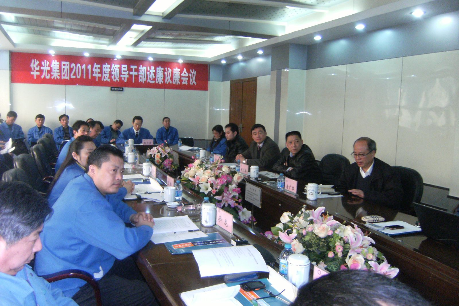 会议首先通报了征求意见和建议情况,集团党委书记、总经理关长文作了《华光集团领导班子2011年度述廉报告》,接着集团党政领导班子成员关长文、张群、陈国良、李龙、俞家宏、周建勇分别结合自身思想、工作和生活实际,结合职工群众意见建议,对照贯彻落实《中国共产党党员领导干部廉洁从政若干准则》和《国有企业领导人员廉洁从业若干规定》等党纪条规规定,对照贯彻执行党风廉政建设责任制的要求,逐一汇报了个人廉洁从业和党风建设情况,总结了成绩和不足,明确了下一步的努力方向。与会人员填写了《领导班子党风建设和反腐倡廉情况民主评议表》和《领导班子成员党风建设和反腐倡廉情况民主评议表》,以无记名形式对领导班子及其成员党风建设和反腐倡廉情况进行了民主评议。