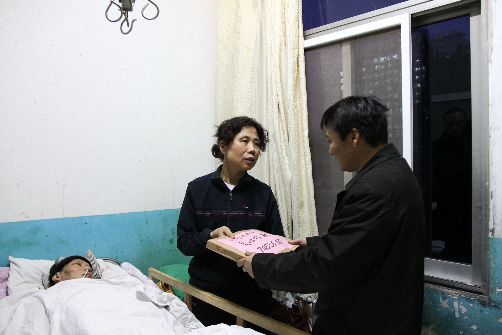 贾晋川的妻子接过捐款时,已激动地说不出话来,只是一个劲地重复着“谢谢、谢谢”,贾晋川的儿子代表一家人感激地说:“感谢公司/院领导和员工的无私帮助,感谢凯盛这个‘大家’对我们‘小家’的照顾,这对我们家来说真是雪中送炭,真的觉得很温暖。我代表全家人感激公司/院的所有同事们!”此时,贾晋川刚从高压氧舱推出来,躺在病榻上的他已有了些许知觉,他用力地眨了眨眼睛,想表示感谢,但因为用力过猛而引发了剧烈的咳嗽,他的家人说,他这是太激动了,是衷心向大家表示感谢。