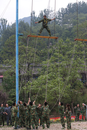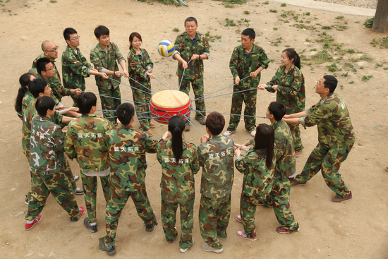 在教练的组织和安排下,43人的被分为飞鹰队和野狼队两个分队进行比拼训练。两个小分队并分别为其制作了队旗,选取了队呼及队歌。在接下来的训练里,两队分别在各自教练的带领下完成了以下项目——空中接力、高空八字桥、真人CS、孤岛求生、鼓动人心、穿越电网、绝壁求生、盲人与哑巴等个人与团队协作项目。无论是在个人挑战项目里,参与队员所表现出的勇气以及队友间的协助与关爱,还是在团队项目中,队友之间的互相协作,发挥聪明智慧,及众人之力,完成团队挑战项目。 在盲人与哑巴项目中,扮演盲人的队员在哑巴队员的搀扶下,在崎岖泥泞的山坡上,行走了20分钟的路程,彼此之间从陌生与担心,到相互信任与陪伴,到最后安心与坦然。让在座的每一位队员内心都产生了微妙变化,大家在分享感悟时,也是百感交集,找到了内心深处的真性情,希望这份感悟,会伴随每一个人今后的人生旅程。