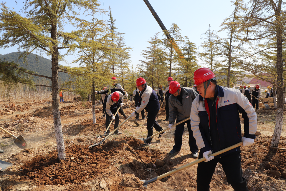 植树地点选在徐州中联矿山生态修复区。山地植树是一项十分辛苦的劳动。先是由挖掘机在矿山平台上挖出一个个树坑,大家拿起十字镐对大块的粘土进行破碎,用手推车一车一车运送种植土并填入树坑,四五个人一组将一棵棵雪松扶正、立直,挥锹铲土填入树坑,然后培实新土堆起围堰。经过一上午紧张的劳动之后,40余棵胸径约15厘米的雪松傲然挺立成林,大家将认领牌牢牢地系在了自己参与栽种的树干上,也将绿色的希望深深地洒在了脚下的土地上。