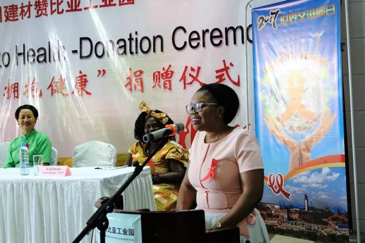 耿海凌女士在致辞中表示,艾滋病是全人类共同面临的挑战,关乎社会稳定、经济发展甚至国家安全。中国政府也正采取措施抵抗艾滋病,并取得显著进展。在落实本国抗艾工作的同时,中国还与国际团体合作,为实现联合国设定的在2030年消除艾滋病的目标而努力。耿海凌讲到,中国国家主席夫人、世界卫生组织结核病和艾滋病防治亲善大使彭丽媛积极投身中国和全球的抗艾工作,赞比亚总统夫人埃斯特·伦古女士也在致力于推动本国的艾滋病防治和公共卫生事业发展,携手抵抗艾滋病是中赞两国元首夫人共同努力的一部分,更是加强两国友谊的重要部分。她希望越来越多的在赞中资企业,像中材Mpande公司一样,将防治艾滋病作为履行社会责任的一部分,积极参与到其中来。