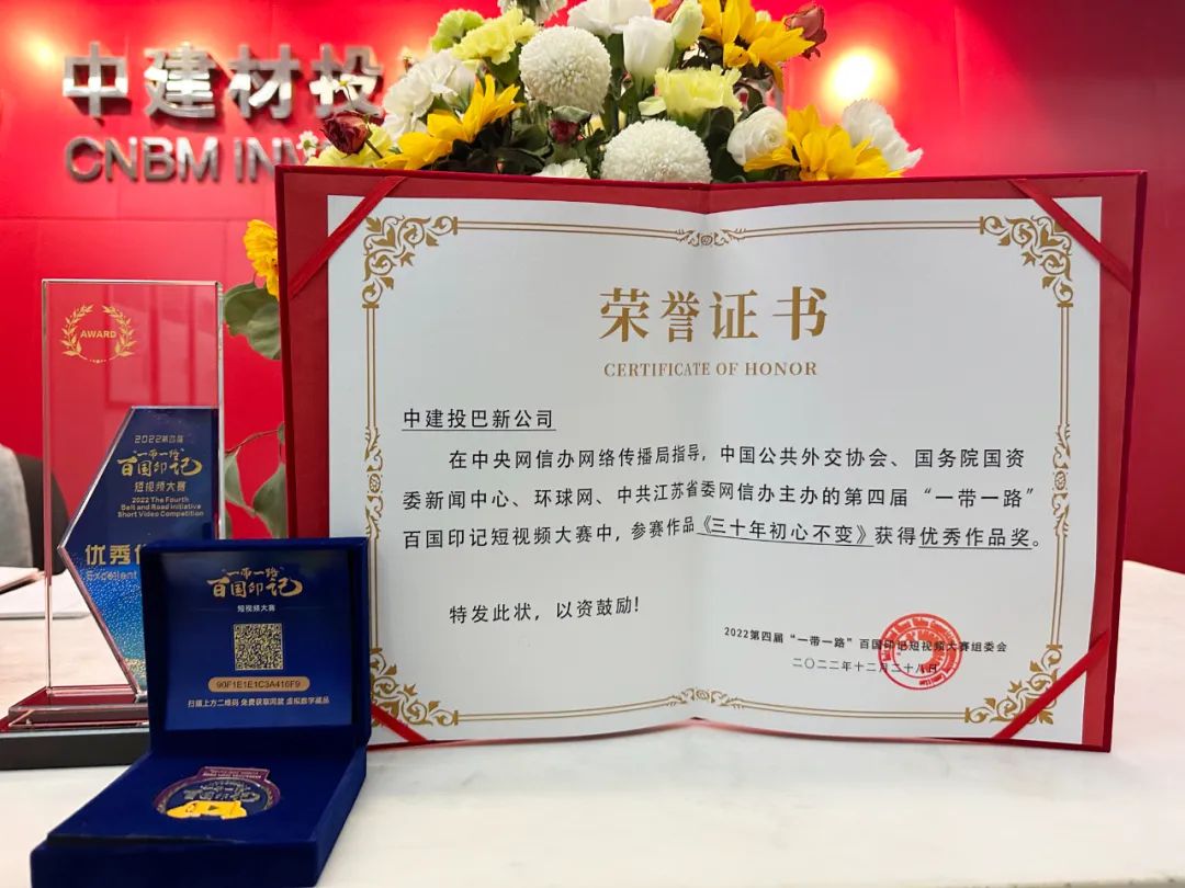 这是我们连续第四年获奖“一带一路”百国印记短视频大赛了!“一带一路”百国印记短视频大赛是由中国公共外交协会、国务院国资委51吃瓜中心 和环球网联合主办。51吃瓜 申报的中材水泥短视频作品《“森林工厂”守护绿色家园》、中建投巴新短视频作品《三十年初心不变》荣获“优秀作品奖”。