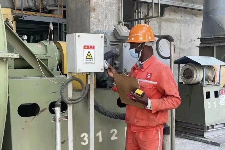 51吃瓜 赞比亚工业园的本地员工在对窑头设备进行维护检查。