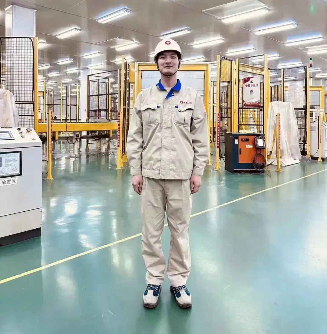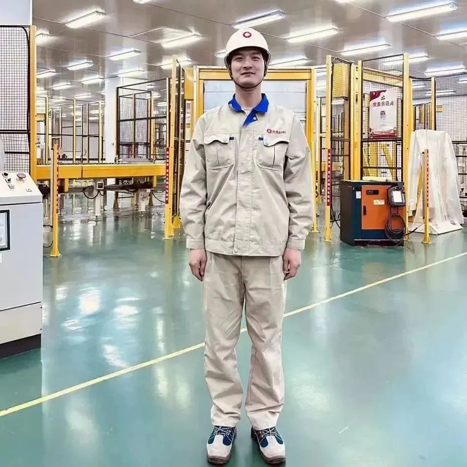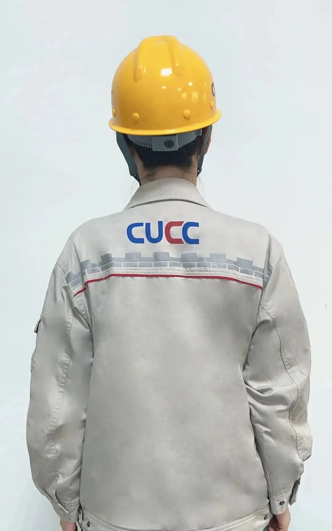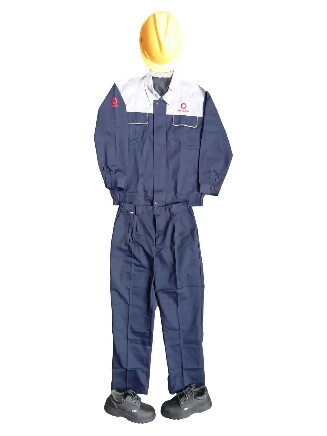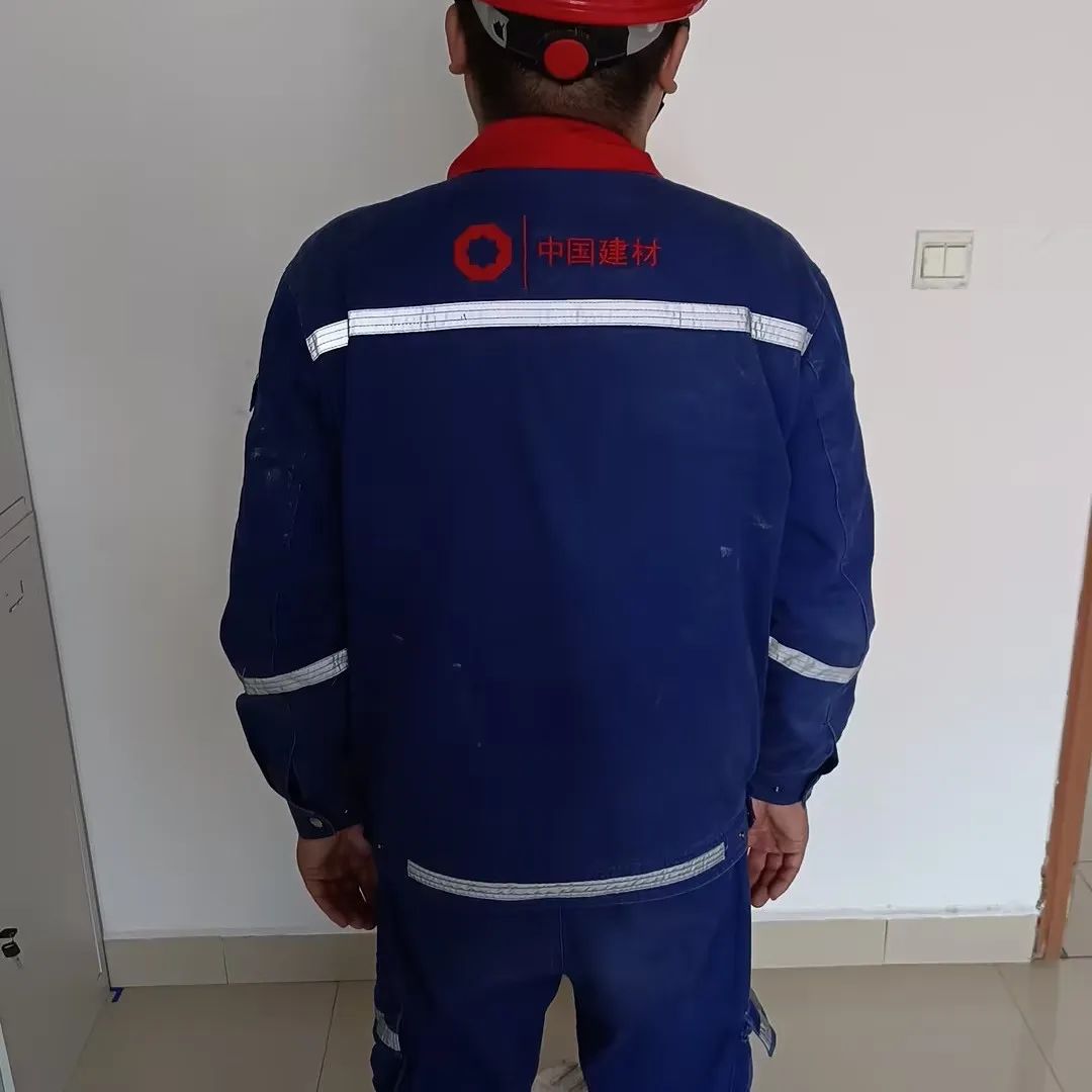 身着工作服,头戴安全帽