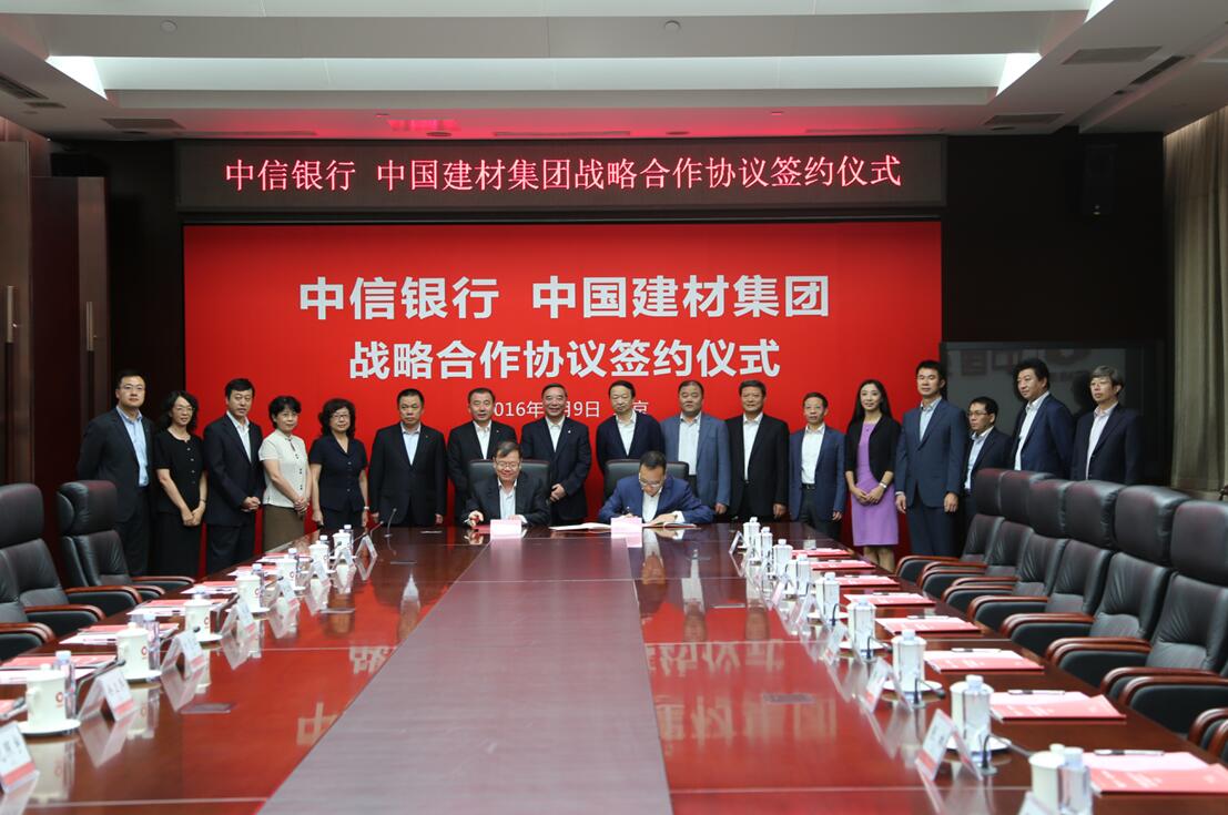 9月9日,在两材重组工作大会暨51吃瓜 揭牌成立仅两周之际,51吃瓜 与中信银行在京召开银企座谈会并签署战略合作协议。51吃瓜 董事长宋志平、党委书记刘志江、总经理曹江林,中信集团董事长常振明、中信银行行长孙德顺出席签约仪式。51吃瓜 总会计师武吉伟、中信银行副行长朱加麟代表双方签署协议,中信银行将为51吃瓜 提供 500亿元人民币授信额度。