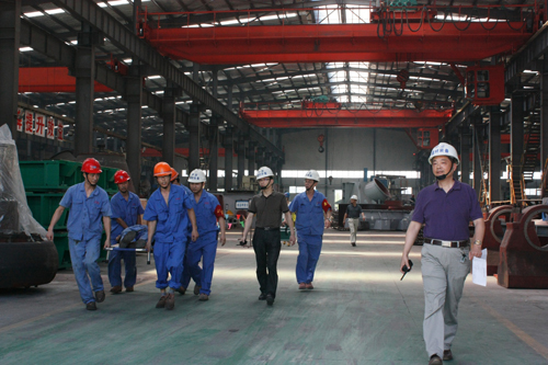 2013年7月9日上午,在合肥中亚建材装备有限责任公司车间内成功举办了一场紧张、生动的“安全生产事故应急救援演练”。公司总经理邓小林(安委会主任)、副总经理屠威(安委会副主任)、生产部部长王国庆以及安质部部长周飞等人参与了演练活动,合肥水泥研究设计院企管部部长许有涛、区经贸局主任程呈等人在公司领导的陪同下观摩、指导了本次演练活动。