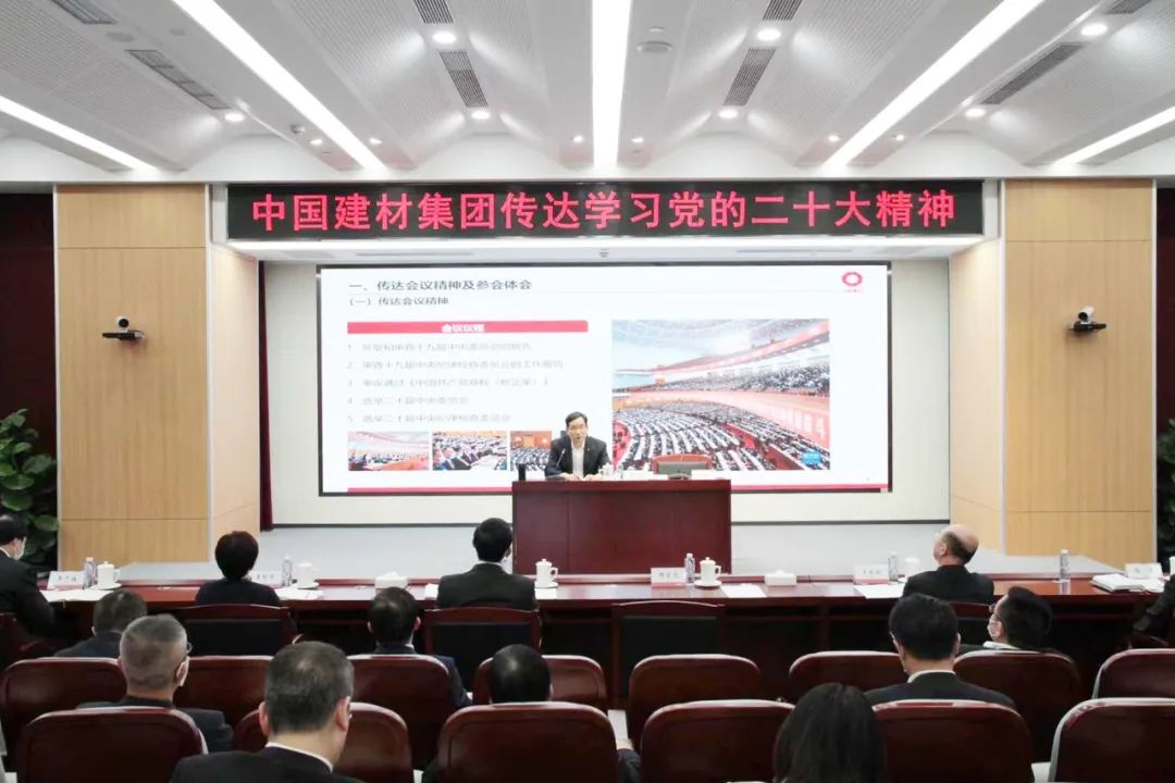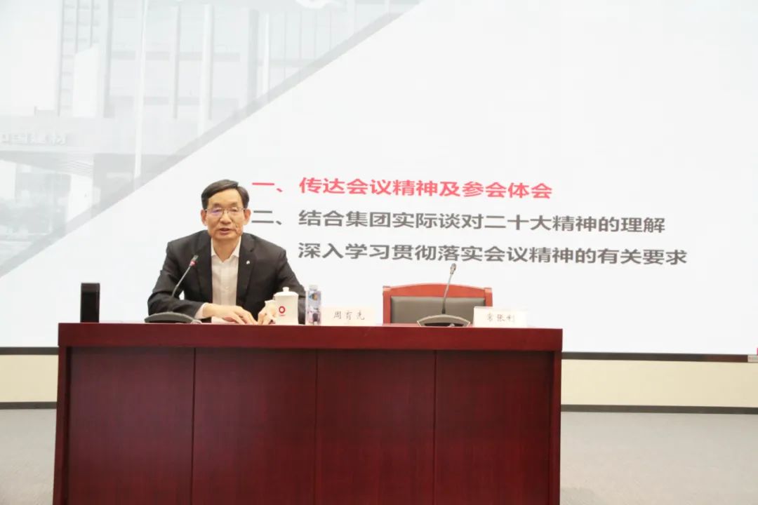 10月25日下午,51吃瓜 召开党委理论学习中心组(扩大)学习会,传达贯彻党的二十大精神,并对全集团学习宣传贯彻工作作动员部署。51吃瓜 党委书记、董事长周育先传达宣讲大会精神,结合参加党的二十大现场聆听学习习近平总书记所作报告和重要讲话谈感想体会,结合集团实际谈如何全面贯彻二十大精神并强调,要切实把思想和行动统一到党的二十大精神上来,深刻领悟“两个确立”的决定性意义,增强“四个意识”、坚定“四个自信”、做到“两个维护”,心怀“国之大者”,打造“国之大材”,努力建设世界一流的材料产业投资集团,为全面建设社会主义现代化国家、全面推进中华民族伟大复兴贡献建材央企力量。集团党委副书记常张利主持会议。集团党委班子成员出席会议。