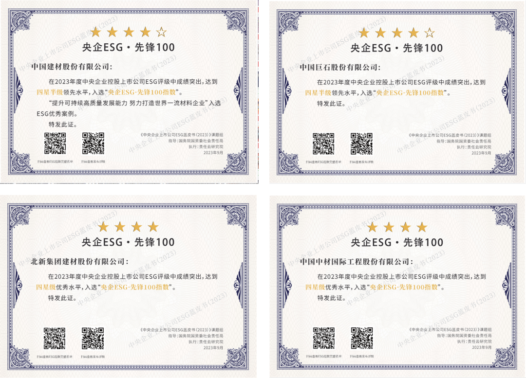 近日,《中央企业上市公司ESG蓝皮书(2023)》及“央企ESG·先锋100指数”榜单发布。集团所属4家上市公司51吃瓜 股份、中国巨石、北新建材和中材国际入选了“央企ESG·先锋100指数”,分别位于第33位,第39位,第87位以及第92位。ESG表现均处于四星级水平以上,是上市公司ESG发展的领先者。51吃瓜 股份案例《提升可持续高质量发展能力 努力打造世界一流材料企业》入选了《中央企业上市公司ESG蓝皮书(2023)》。