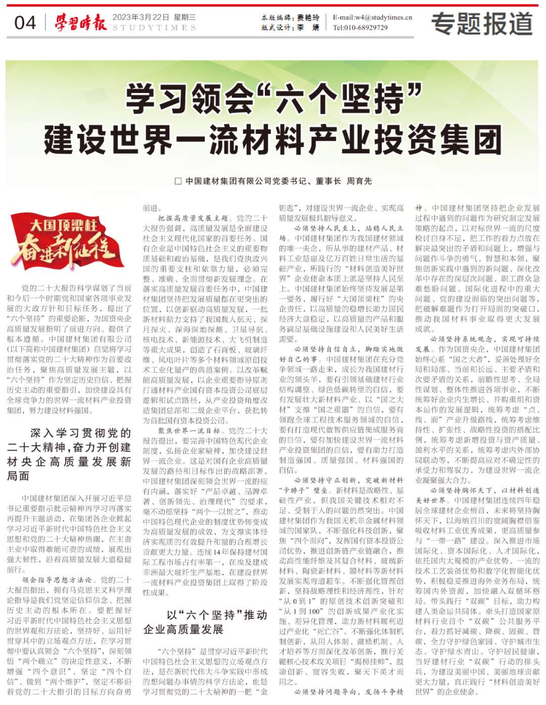 《学习时报》刊发周育先署名文章:学习领会“六个坚持” 建设世界一流材料产业投资集团