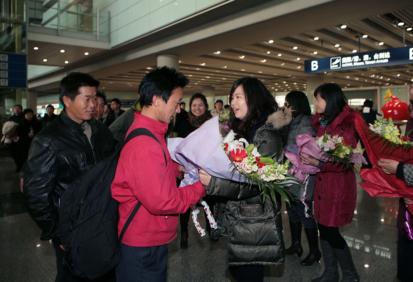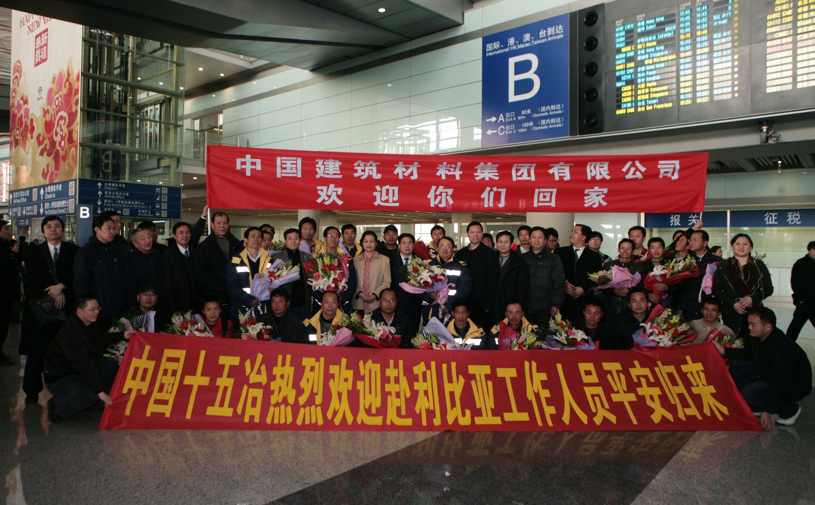 2月27日下午三点,集团公司总经理姚燕,党委副书记郝振华,副总经理马建国、黄安中,总经理助理兼国际部总经理卫锋等来到首都国际机场,迎接首批从利比亚回国的29名员工。
