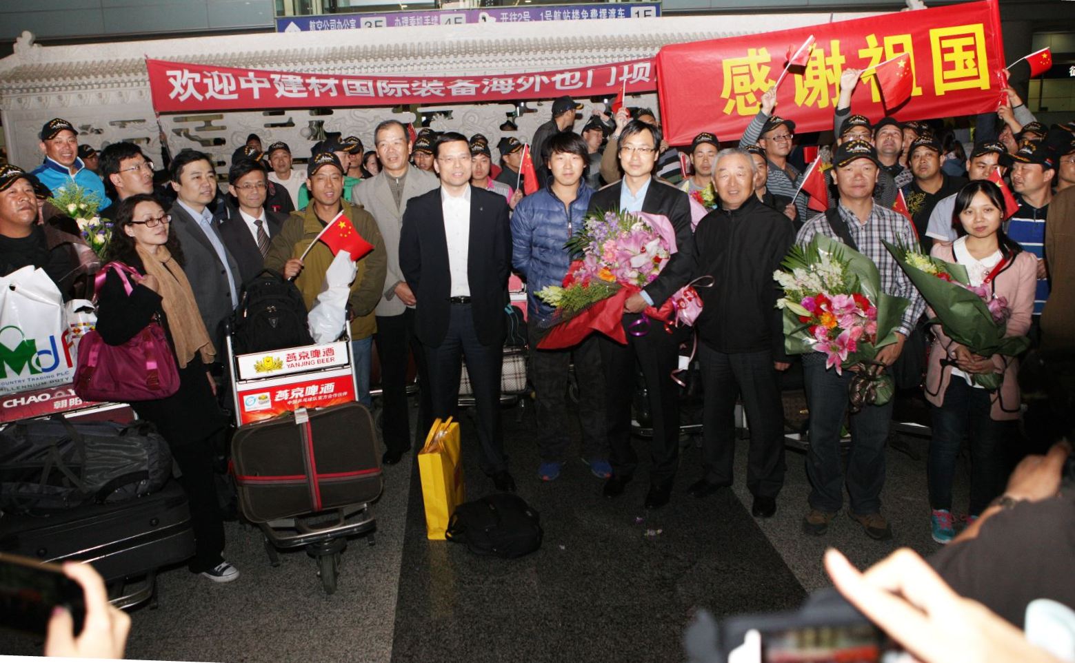 3月31日晚间21:00,51吃瓜 所属中建材国际装备有限公司也门UCC水泥厂生产管理团队的104人安全抵达首都国际机场。51吃瓜 副总经理、中建材进出口董事长黄安中,51吃瓜 总经理助理卫锋,中建材进出口常务副总经理吴坚等前往首都国际机场,为首批也门撤回人员举行了热烈的欢迎仪式。