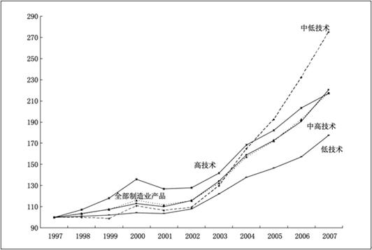 (1)生产技术的扩散。最直接的生产技术扩散途径是技术转让和生产性投资。技术产品贸易也能促进技术的扩散。图2是1997-2007年不同技术水平制造业产品的贸易指数,贸易的扩张带动了技术的扩散。