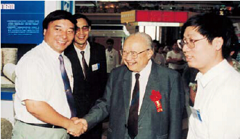 1993年8月18日,钱伟长视察新型建材展会,对北新...